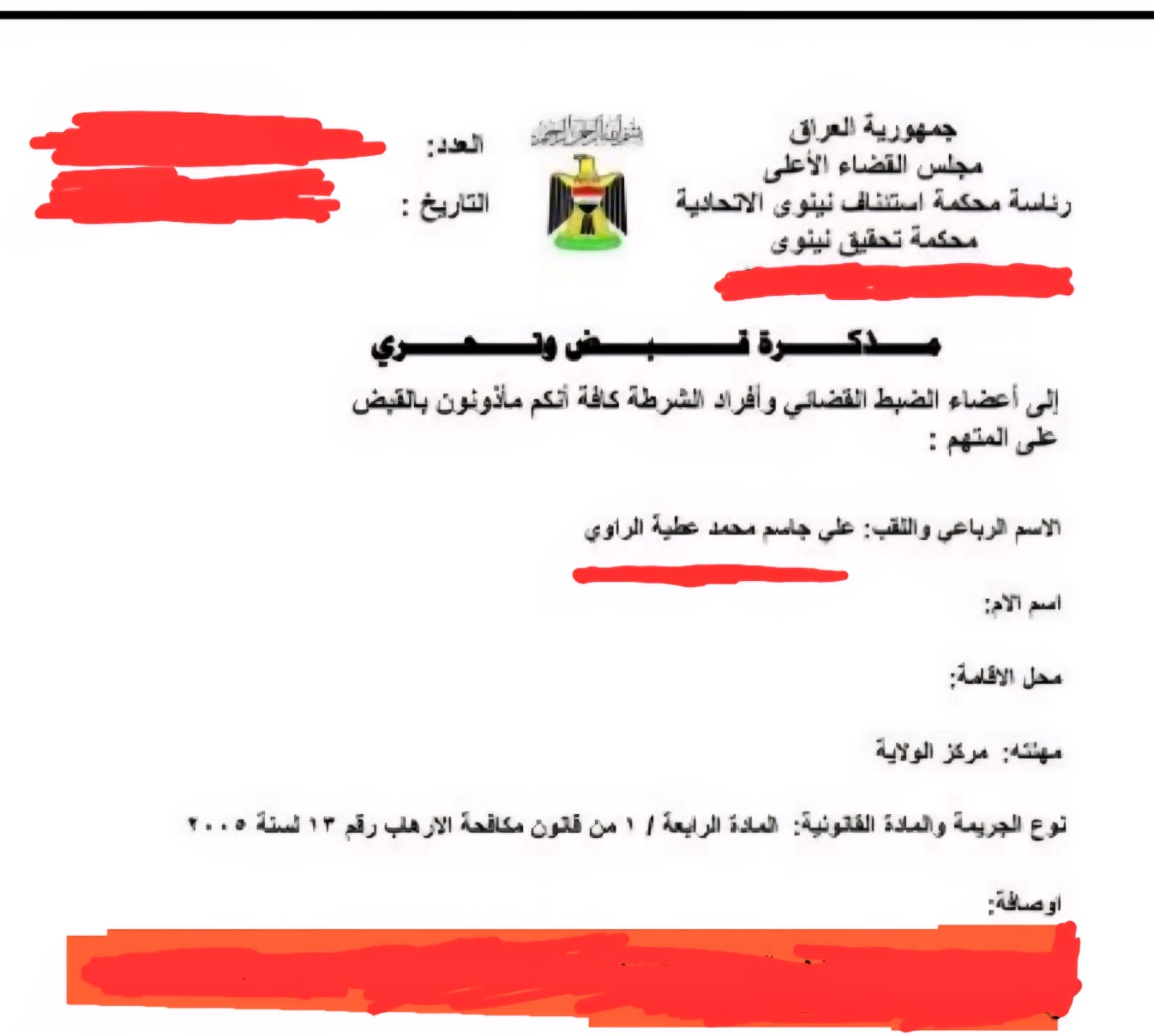 وأكد هوية المعتقل بانه “الارهابي علي جاسم محمد عطية الراوي والذي يحمل ثلاث كنى داخل التنظيم (ابو ايمن الراوي، أيوب، ابو عبد الله)، من تولد 1978، وينحدر من محافظة كركوك منطقة الزاب”.