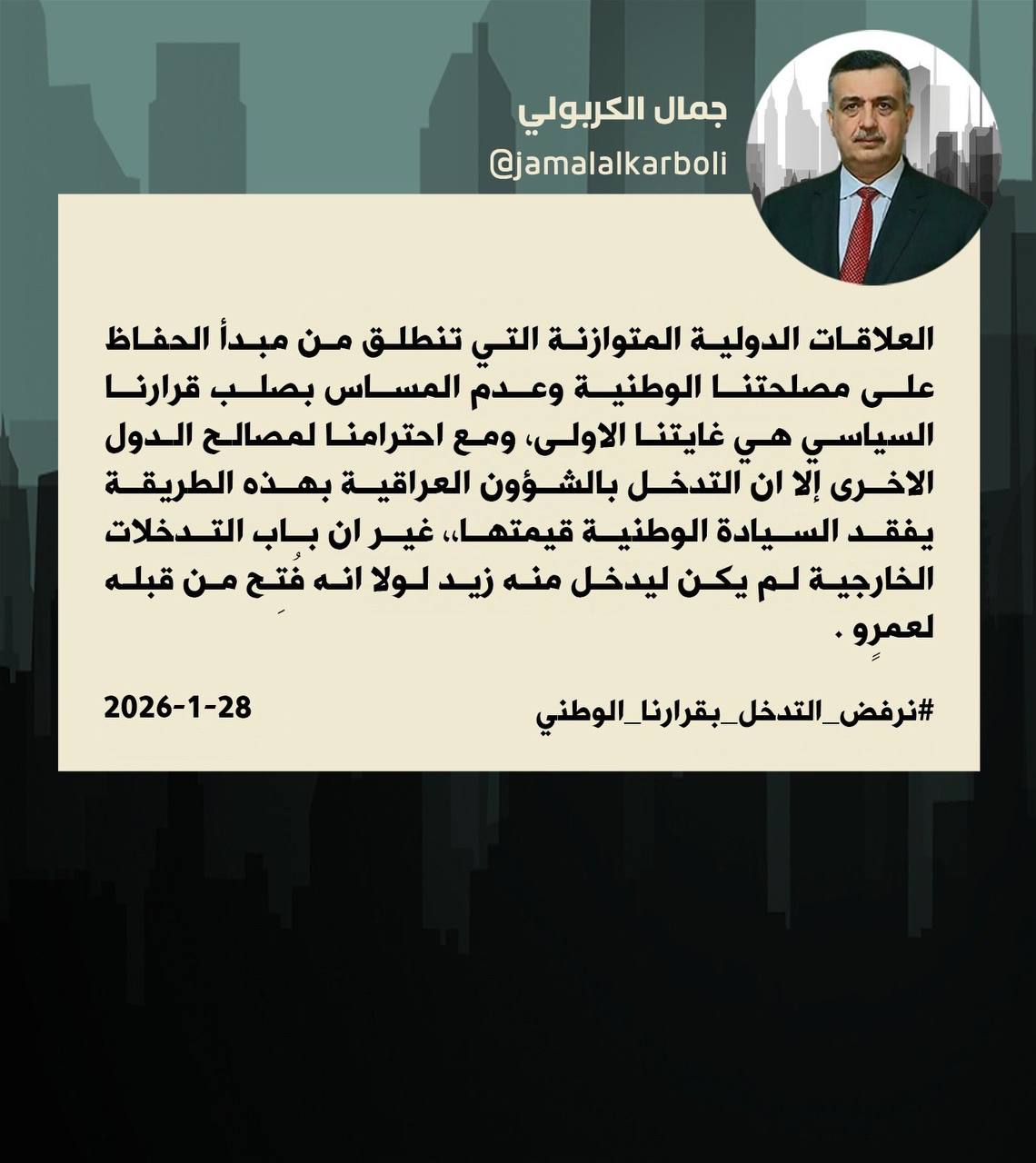 وقال الكربولي، في تدوينة له على موقع التواصل الاجتماعي (X) اطلعت عليها “زقورة نيوز” إن “العلاقات الدولية المتوازنة التي تنطلق من مبدأ الحفاظ على مصلحتنا الوطنية وعدم المساس بصلب قرارنا السياسي هي غايتنا الأولى، ومع احترامنا لمصالح الدول الاخرى إلا ان التدخل بالشؤون العراقية بهذه الطريقة يفقد السيادة الوطنية قيمتها، غير ان باب التدخلات الخارجية لم يكن ليدخل منه زيد لولا انه فتح من قبله لعمرو”.